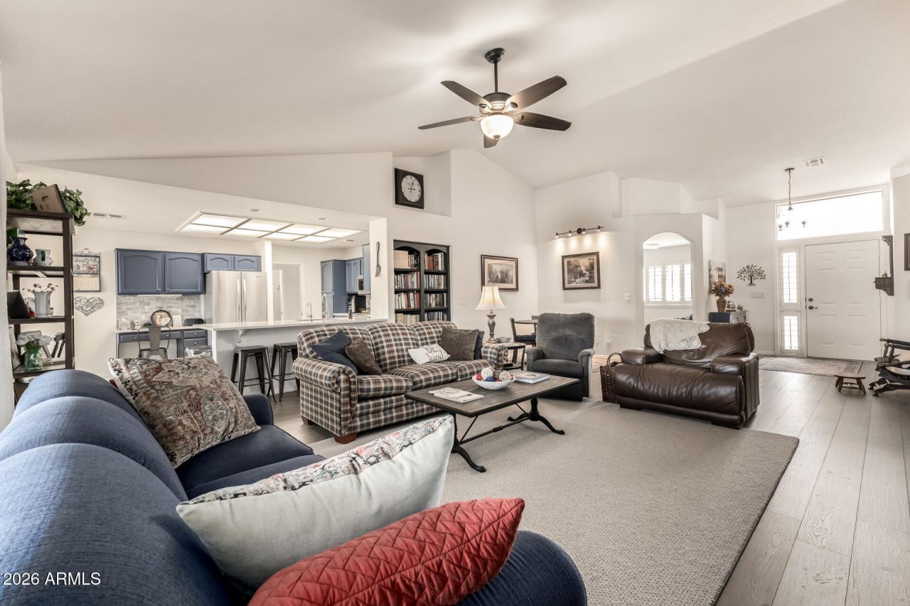 Welcome home! This inviting corner-lot property charms with stone accents on the facade and a spacious 2-car garage (21 x 28.5) featuring attached cabinets for extra storage. Inside, vaulted ceilings and wood-look floors create an airy feel. The living and dining room flows seamlessly, while a quiet den is perfect for a home office. The kitchen shines with stainless appliances, , quartz counters, a tile backsplash, and a peninsula with breakfast bar. Main bedroom boasts a private bath with dual sinks, a soaking tub, and walk-in closet. Outside, a covered patio overlooks a sizable low maintenance backyard, with roller shields on the back patio for added security and convenience. Community amenities include a pool, pickleball, tennis, fitness centers, and so much more!
