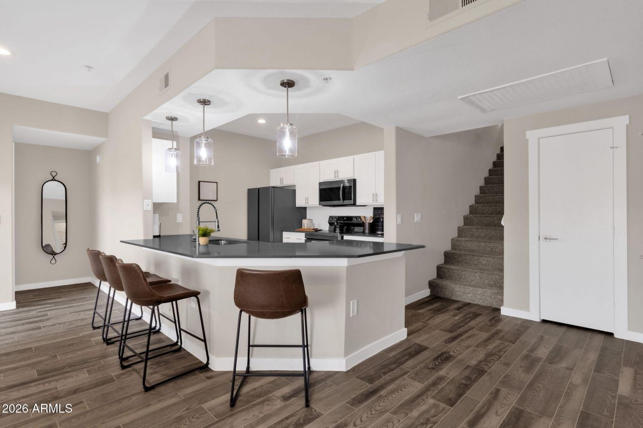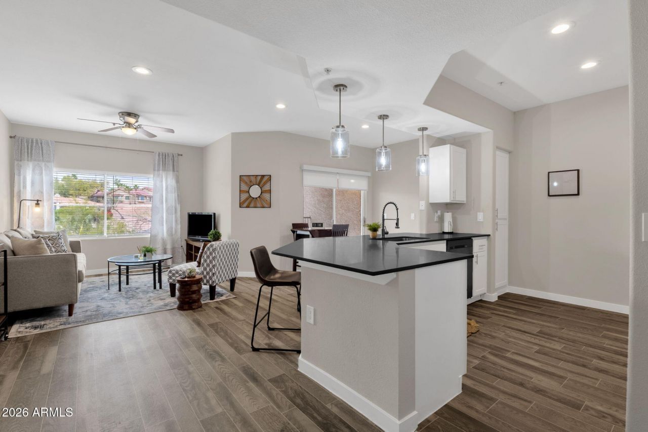 If youre looking for easy desert living with a little extra space, this 2-bedroom, 2-bath condo in the Four Peaks community of Fountain Hills checks all the boxes. With its classic Southwest exterior and private entry, it feels welcoming from the moment you arrive.Inside, the open layout makes everyday living feel effortless. The main living area features wood-style flooring, neutral tones, and plenty of natural light. The kitchen is both stylish and functional, with white shaker cabinets, dark countertops, stainless steel appliances, and a breakfast bar thats perfect for quick meals or catching up with friends. Sliding glass doors lead out to a covered balcony where you can relax and take in the desert views. The primary bedroom offers a comfortable retreat with soft carpeting, a ceiling fan, good closet space, and its own en-suite bath. The second bedroom and full bathroom give you flexibility for guests, a home office, or whatever fits your lifestyle. Youll also appreciate the in-unit washer and dryer, extra storage, and the convenience of carport or attached garage parking.Living at Four Peaks means access to great amenities, including a resort-style pool, spa and hot tub, steam room, sauna, fitness center, theater room, business center, and BBQ areas--all within well-maintained grounds. The community is pet-friendly and even offers flexible lease terms.Located in an International Dark Sky Community, Fountain Hills is known for its incredible night skies and scenic desert surroundings. With quick access to the 101 and 87, getting around Maricopa County is simple, and youre just minutes from downtown Fountain Hills restaurants, shops, and entertainment. Its a comfortable, low-maintenance home in a location that makes everyday living easy.
