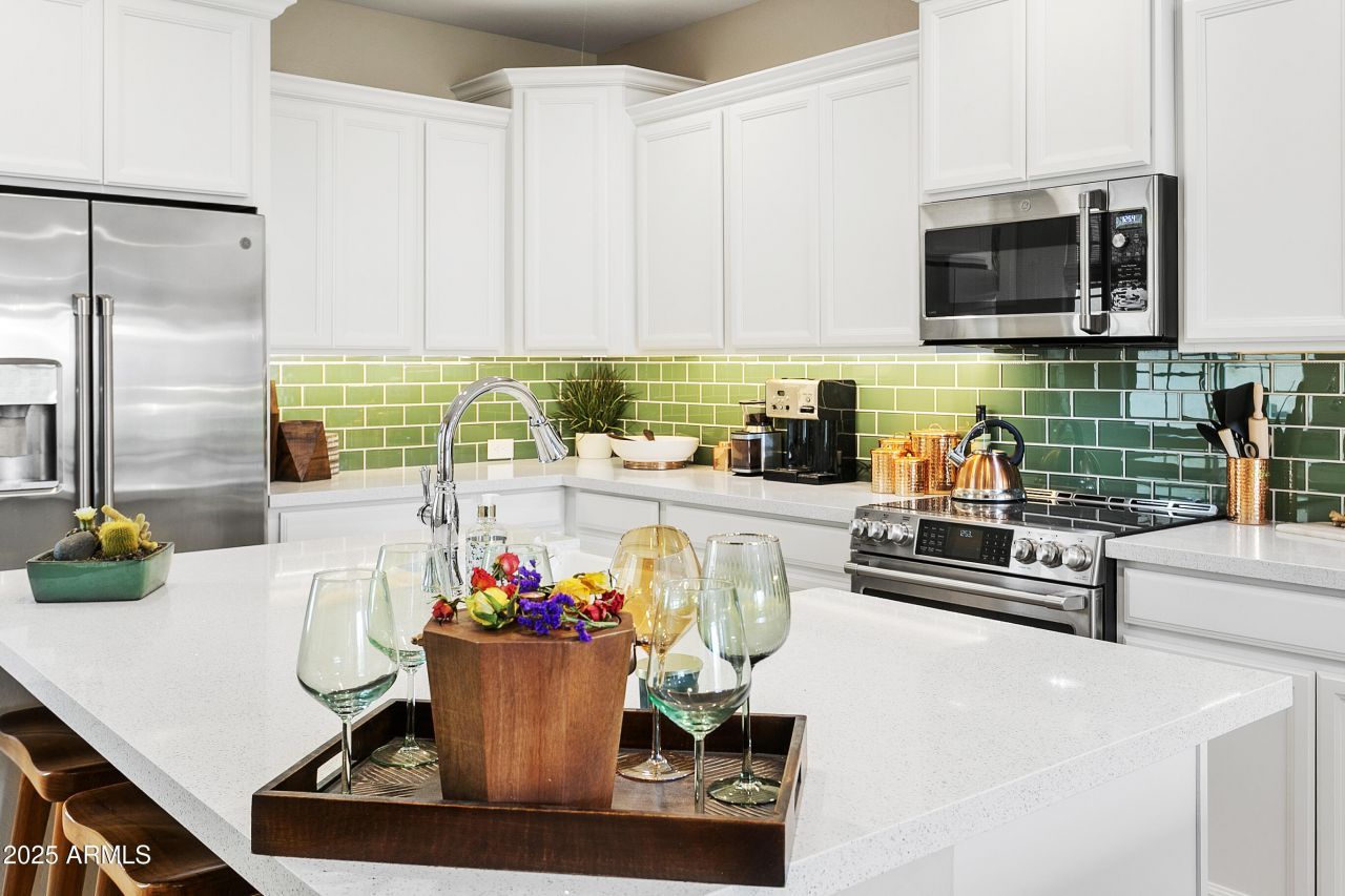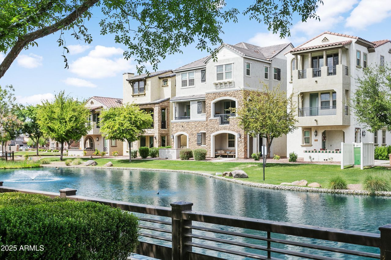 This is it! Lakefront premium homesite with views out of every window! Stunning 3-level prior model home has extra lavish upgrades that include extended kitchen island counter and seating, white apron designer undermount kitchen sink, gourmet GE Cafe stainless appliances, pre-wired speaker system with bluetooth throughout home and patios, sliding glass door upgrade for 2nd level patio, light wood color porcelain tile flooring throughout. Upon entry, you will find a 2-car tandem garage with plenty of space for storage and soft water system and custom epoxy flooring. On the second level, enjoy the spacious open concept living room and kitchen area, with natural light pouring through every window. Enjoy your coffee with views of the lake on both the lower and upper patios. The 3rd floor leads to both bedrooms, there are lakefront views from the primary bedroom with a walk-in closet, cultured marble double vanities and tile surround shower. Home is located near San Tan Mall and popular restaurants within walking distance. The Lakes at Annecy is a gated community with 3 community pools, spas, walking paths, landscaped trees and flowers, turtles and ducks, several lakes and playgrounds. Dont miss your chance at this one of a kind well kept model home with this waterfront view!