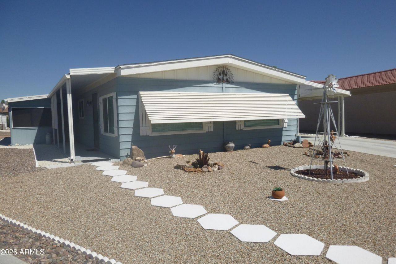 We have a very nice two bedroom/two bathroom manufacture home. Located in the community of Apache Wells. The home will come completely furnished. The home is located on a large lot in the middle of a circle on Floyd Dr. The home has a very useable Arizona room with its own AC unit. There is an amazing golf cart or work shop with a sink and lots of cabinets. Apache Wells is a 55 plus community with activities for every one.
