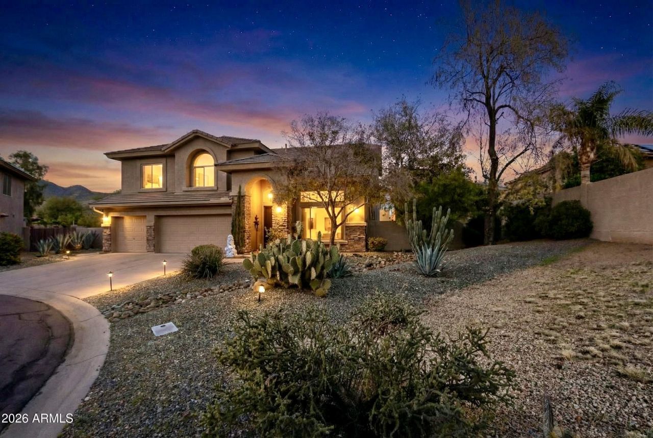 Enter into a spectacular, thoughtfully designed residence set on nearly a third of an acre in the highly sought-after La Buena Vida Estates of Cave Creek. From the moment you arrive, this home is flooded with natural light, creating a bright, warm, and welcoming atmosphere throughout.The heart of the home is a chefs kitchen that effortlessly blends function and design, featuring an impressive 8-burner Viking range with custom Viking hood, top-of-the-line KitchenAid refrigerator and microwave, and a dedicated wine fridge. Designer cabinetry, a custom backsplash, and beautiful oak hardwood floors elevate the space, which opens seamlessly to a large family roomperfect for everyday living and entertaining alike.The main level also offers a spacious living room with a fireplace, a formal dining room, a stylish full bath with custom tile and full glass doors, and a private den or office tucked just off the family room.Upstairs, the primary suite is a true retreat, showcasing a generous walk-in closet and a spa-inspired bathroom with a soaking tub and designer tile throughout the shower. Three additional oversized bedrooms and a beautifully finished secondary bath with custom vanity, designer tile, and glass shower door. To finish off the second floor a standout bonus/game room with a built-in bar provides the ideal space for entertaining and opens to a balcony overlooking the pool and backyard.Step outside to experience resort-style living at its finest. An enclosed patio, expansive yard, sparkling pool, BBQ area, and lush landscaping create a private oasis youll never want to leave.Additional highlights include a large three-car garage with abundant storage. Homes of this caliber, in this location, rarely become available. This is a truly special opportunitydont miss it.