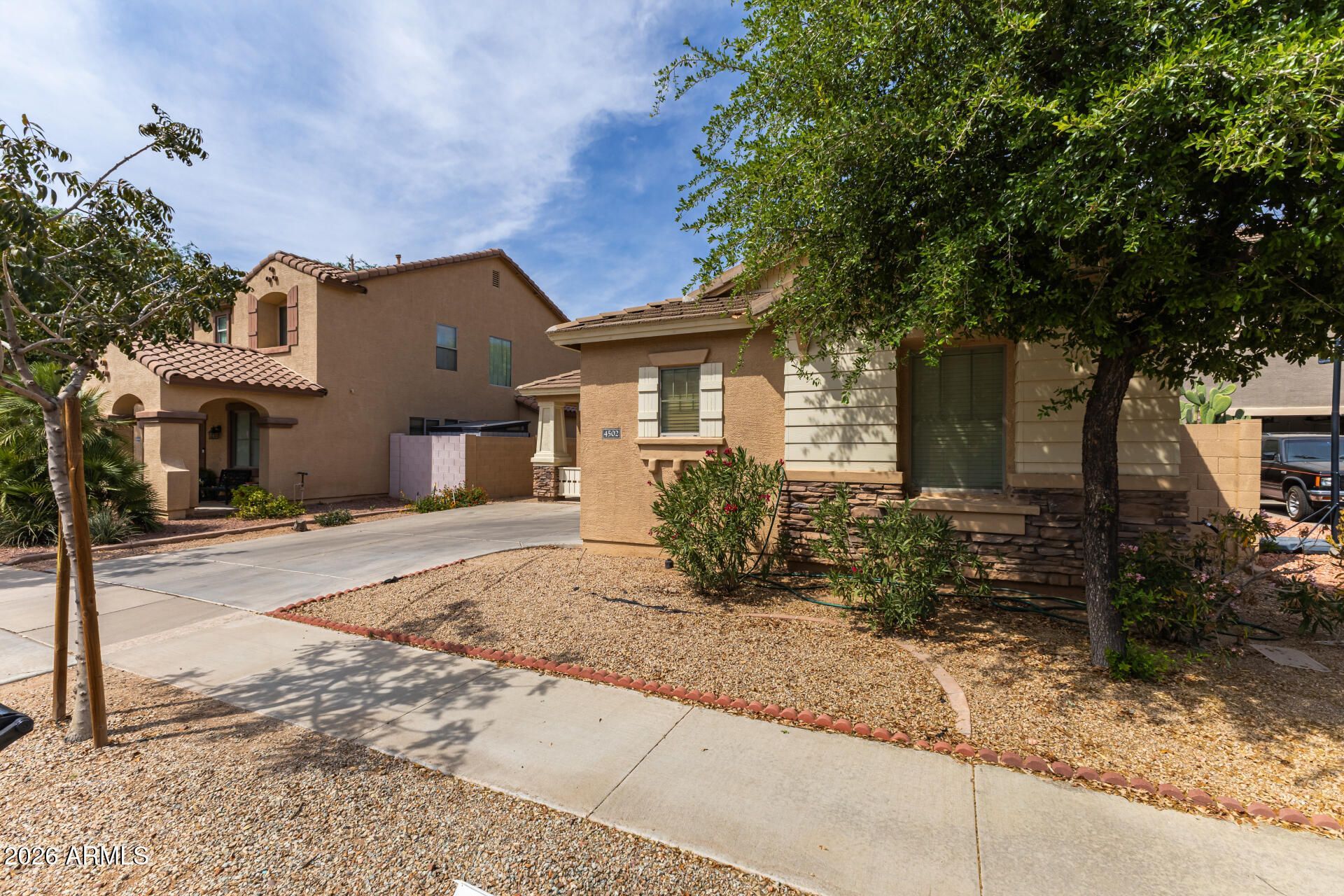 This charming 3-bed + den, 2-bath residence in Gateway Village is the one! A front porch, stone accent details, low-care landscape, and a sided 2-car garage are just the beginning. The inviting interior features a formal living room, abundant natural light, tall ceilings, layered crown molding, and tile flooring in common areas. The eat-in kitchen boasts matching appliances, recessed lighting, a pantry, and French doors to the back. Youll love the double-door den, ideal for an office or extra bedroom! The large carpeted main bedroom has an ensuite with dual sinks & a walk-in closet. Tranquility awaits in the backyard! Featuring a covered patio, artificial turf, & mature trees for refreshing shade. Take advantage of the Community pool, spa, & parks! Make this yours