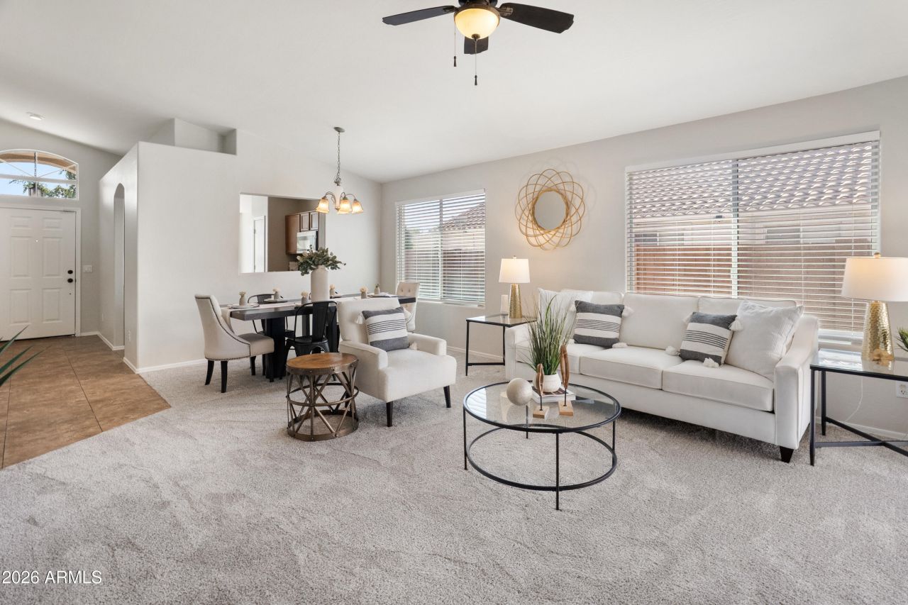 Step inside this beautifully refreshed Glendale home, ideally located just minutes from the vibrant Westgate Entertainment District. From the moment you enter, youll appreciate the tall ceilings and open, airy layout that fills the space with natural light. The large living and dining areas flow effortlessly together, creating an inviting setting for both entertaining guests and everyday living. The kitchen features brand-new stainless steel appliances, fresh paint, new carpet, and a cozy eat-in nook???perfect for casual mornings or family dinners. The primary suite is a true retreat with a relaxing garden tub, separate shower, and an oversized walk-in closet offering plenty of storage. Two additional bedrooms provide flexibility for guests, a home office, or a hobby space. The primary retreat features a large walk-in closet and a well-appointed ensuite bath with a separate soaking tub and walk-in shower. Enjoy unparalleled convenience with close proximity to the ever-expanding Westgate district, home to premier dining, shopping, entertainment, State Farm Stadium, and easy freeway access. Dont miss this opportunity to own a beautifully updated home in one of Glendales most vibrant and convenient locations.