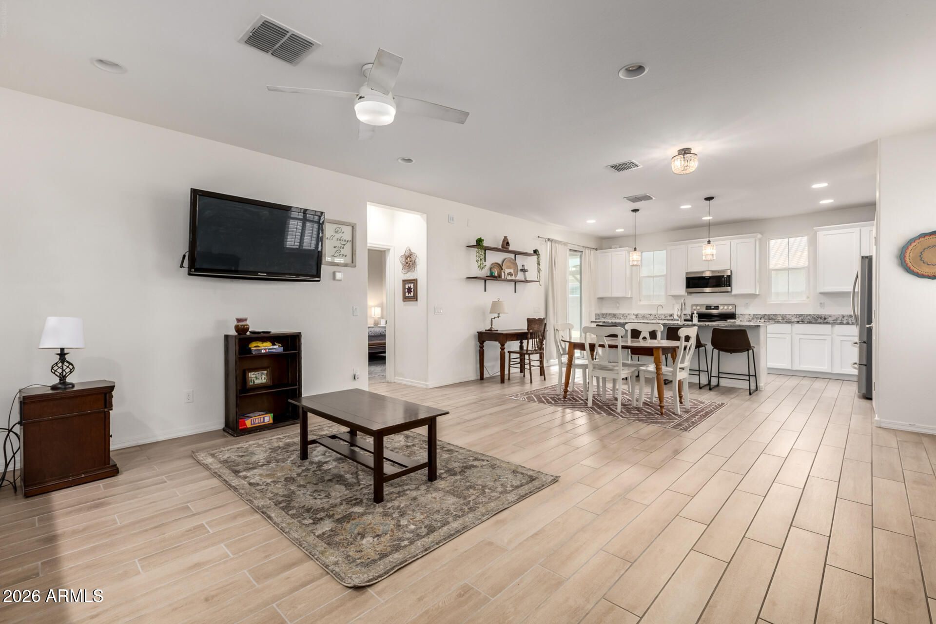 Imagine living minutes from everything Glendale has to offer, yet tucked inside a private gated community of single-level homes? This cute home is located directly across from the community park and features 3 bedrooms, 2 Bathrooms, a 2 car garage, an RV gate with extended driveway, low-maintenance desert landscaping, and an inviting front patio. Inside features an open layout with modern wood-look tile flooring, recessed lighting, classic window shutters & a soothing palette. The kitchen includes granite counters, white cabinetry, SS appliances, a pantry, and an island with a breakfast bar. The primary suite offers dual sinks, a super shower, & walk-in closet. Enjoy the backyard with a covered patio, pavers, a putting green & sand area. Garage includes water softener and RO system.