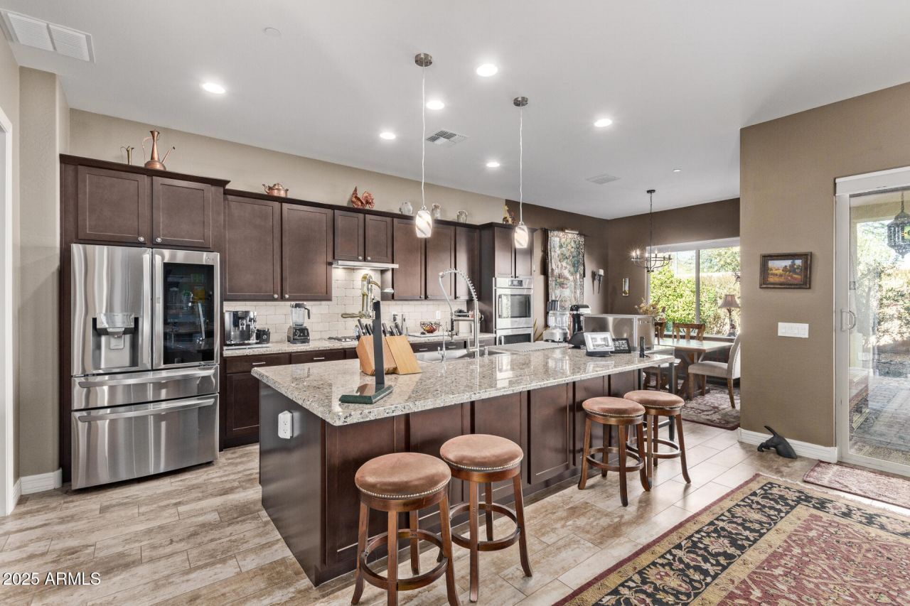 This popular Lancaster plan is located in North Peorias beautiful and gated for privacy, Stonebridge Ranch community. A spacious home with ten-foot ceilings, four bedrooms, 2.5 baths, a large flex room, showcases ceramic wood-like floor tiles, 2824 sq ft, a 12 foot slider off the great room and a French door in the primary bedroom leading to a relaxing mature backyard and a three-car garage. Driveway and walkway pavers, custom iron gates, and a relaxing courtyard lead into this expansive home. Amenities include an upgraded gourmet kitchen featuring striking cabinets, a generous double- sided island, granite countertops, high-end built-in stainless steel appliances, a walk-in pantry, and a large breakfast room. North South exposure with quick access to the 303 Loop and great nearby shopping and restaurants